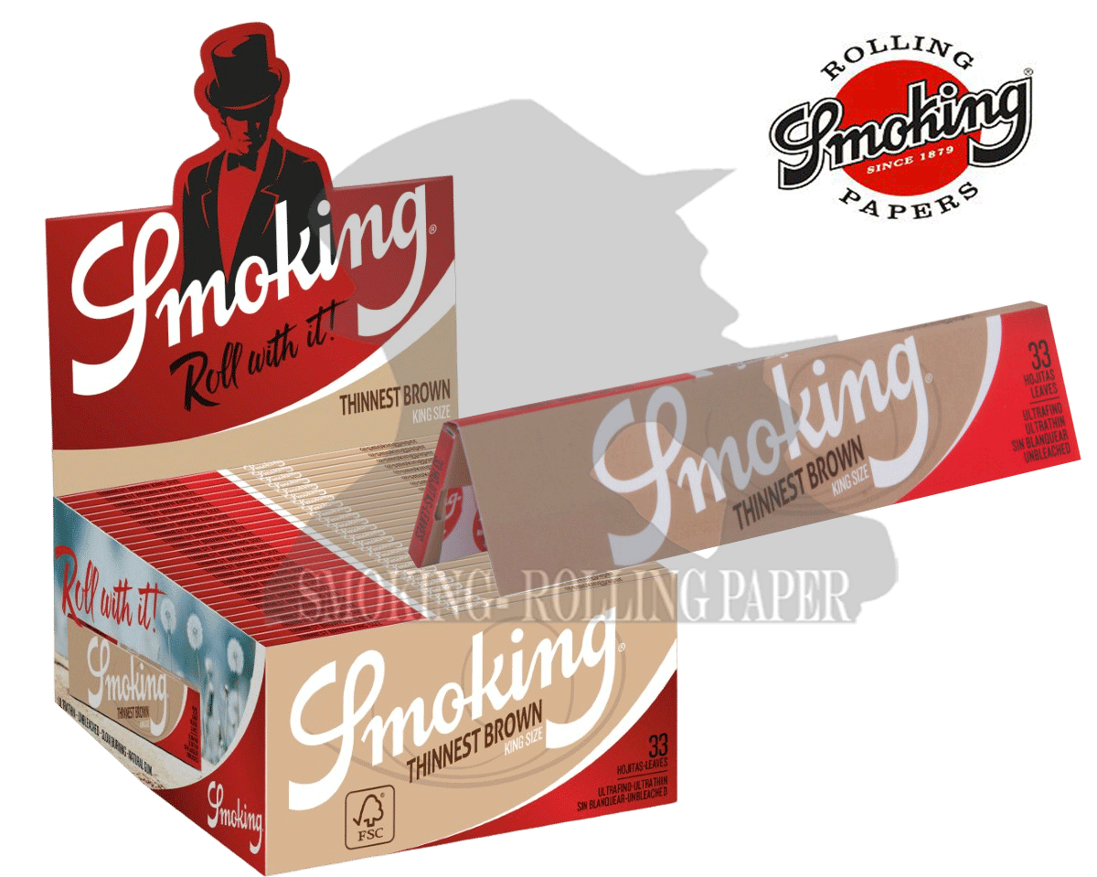 Le Smoking Thinnest Brown King Size Slim sono le cartine più sottili mai prodotte da Smoking®. Realizzate con carta marrone non sbiancata, offrono una fumata leggera e naturale. Ogni scatola contiene 50 libretti, ognuno con 33 cartine lunghe in formato King Size Slim.