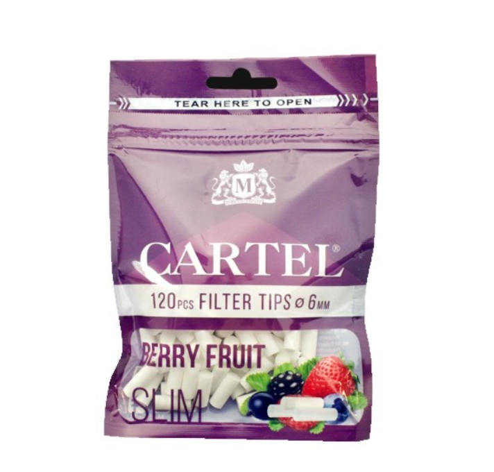 I Cartel Filtri Berry Fruit sono pensati per offrire una fumata aromatizzata al gusto di frutti di bosco, dolce ma bilanciata. Ogni busta contiene 120 filtrini dal diametro di 6.0mm e lunghezza di 15mm, ideali per cartine slim.